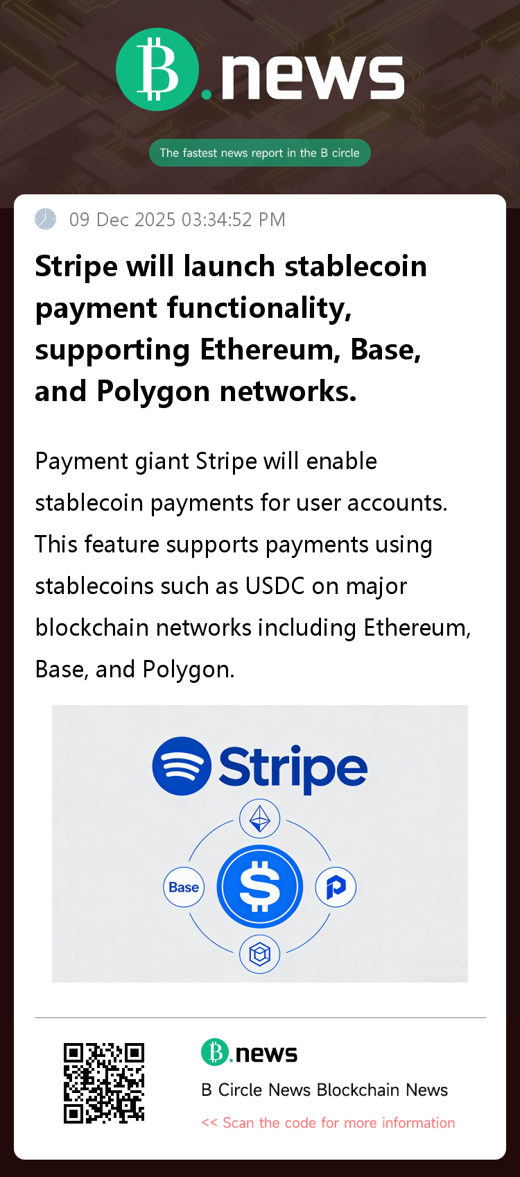 Payment giant Stripe will enable stablecoin payments for user accounts. This feature supports payments using stablecoins such as USDC on major blockchain networks including Ethereum, Base, and Polygon. Stripe states that stablecoin payments are fully integrated into its optimized checkout suite, and existing integrations require no code changes. Regarding fees, stablecoin payments incur a 1.5% charge on the transaction amount (in USD), with no fixed fee. All transactions will be settled in USD to the user's existing payment balance.