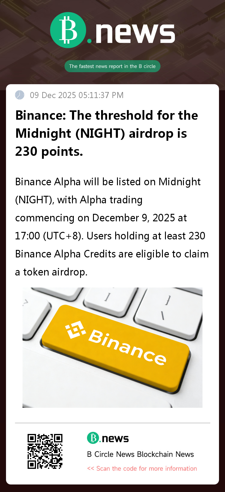 Binance Alpha will launch Midnight (NIGHT) tokens, with trading commencing on December 9, 2025 at 17:00 (UTC+8). Users holding at least 230 Binance Alpha Points can claim an airdrop of 600 NIGHT tokens. Claim the airdrop on the Alpha event page. If the event continues, the point threshold will automatically decrease by 10 points every five minutes. Please note that claiming the airdrop will consume 15 Binance Alpha Points. Users must confirm their claim within 24 hours on the Alpha event page; otherwise, they will be considered to have forfeited their airdrop.