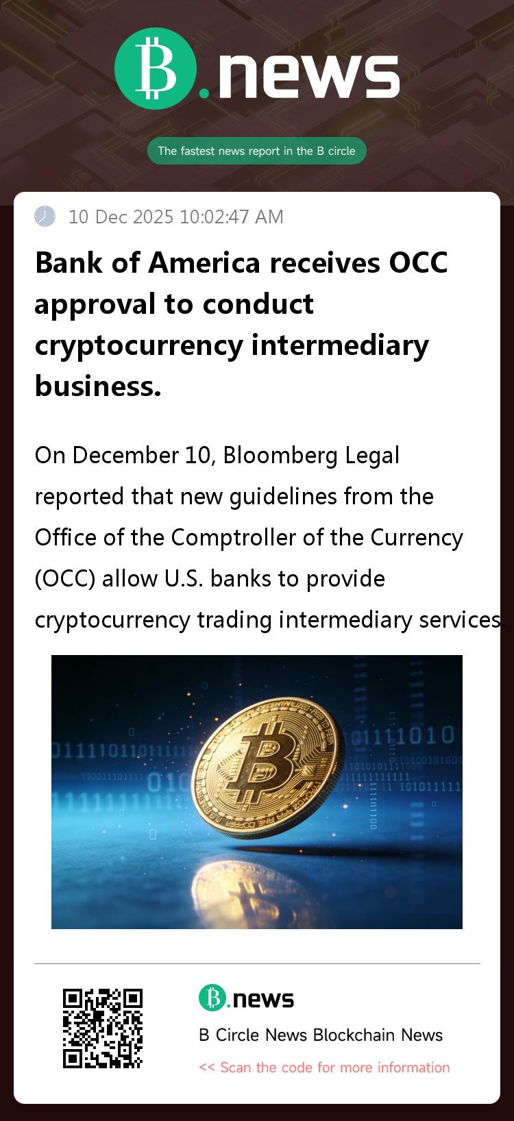On December 10, Bloomberg Legal reported that new guidelines from the Office of the Comptroller of the Currency (OCC) allow U.S. banks to provide cryptocurrency trading intermediary services, further clarifying how traditional lending institutions can legally participate in digital asset transactions. The OCC memo states that banks can act as brokers, purchasing assets from one counterparty and simultaneously selling those assets to another. During this process, the lending institution will not hold any crypto assets.