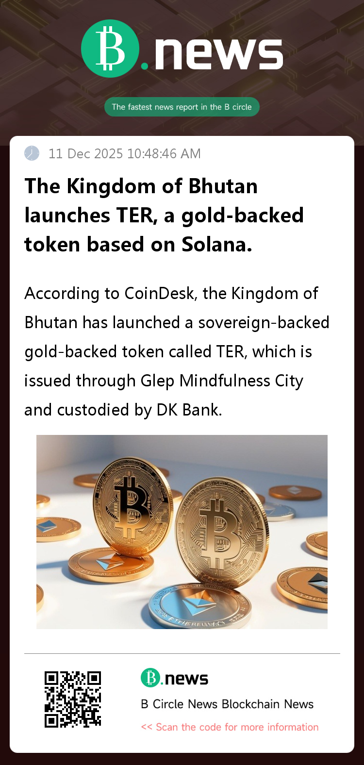 According to CoinDesk, the Kingdom of Bhutan has launched a sovereign-backed gold-backed token called TER, issued through Glep Mindfulness City and custodied by DK Bank. Built on the Solana blockchain, TER provides international investors with a digital representation of physical gold, offering on-chain transparency and global transferability. The token aims to bridge the gap between traditional stores of value and blockchain-based finance, and investors can obtain TER tokens directly through DK Bank, Bhutan's first licensed digital bank.