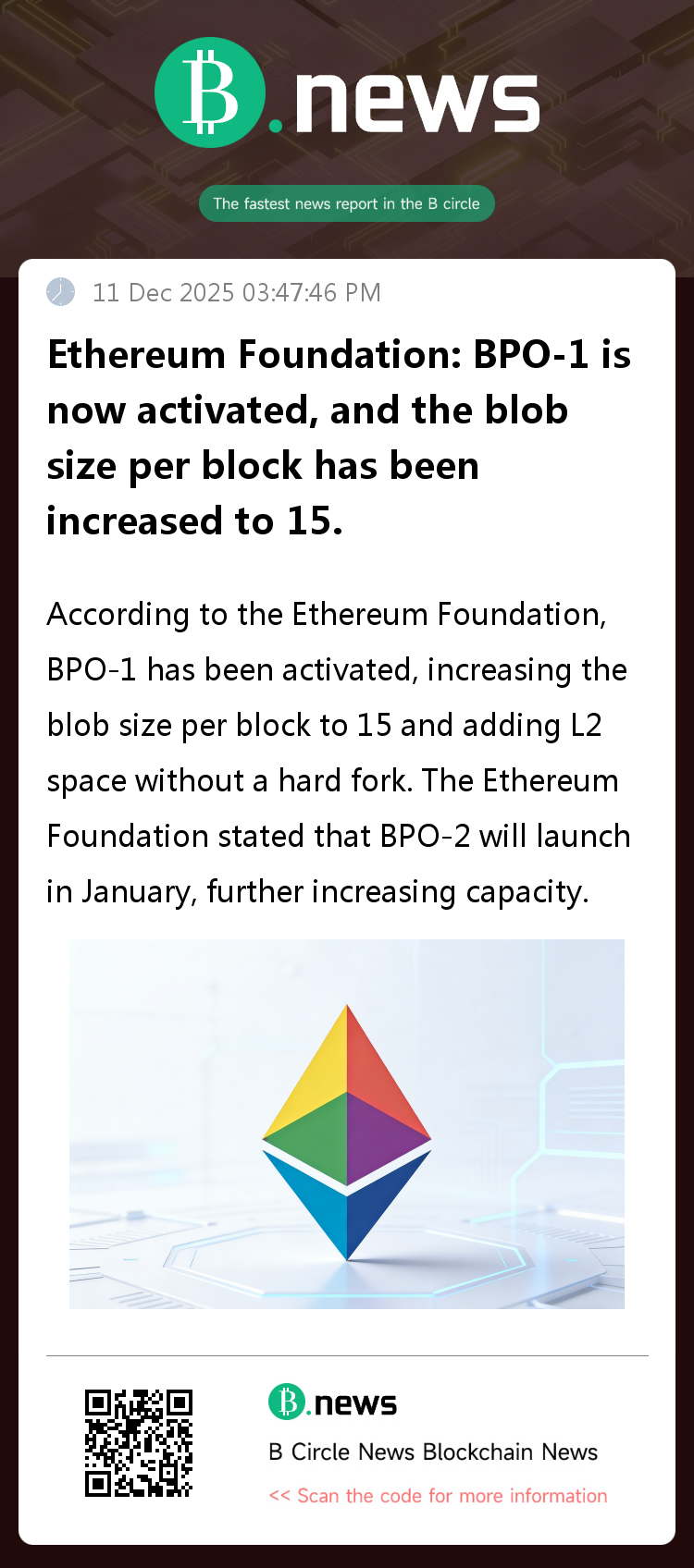 According to the Ethereum Foundation, BPO-1 has been activated, increasing the blob size per block to 15 and adding L2 space without a hard fork. The Ethereum Foundation stated that BPO-2 will launch in January, further increasing capacity. (Source: Ethereum Foundation)