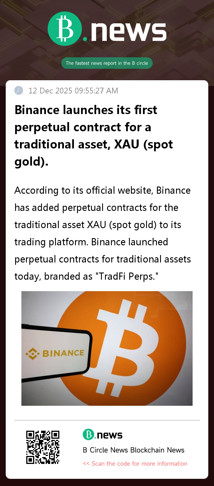 According to its official website, Binance has added perpetual contracts for the traditional asset XAU (spot gold) to its trading platform.