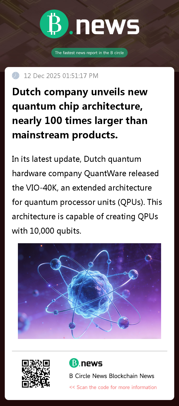 Recently, Dutch quantum hardware company QuantWare released the VIO-40K, an extended architecture for quantum processor units (QPUs). This architecture can create QPUs with 10,000 qubits, nearly 100 times the capacity of the current industry leader. For example, Google's quantum chip increased from 53 qubits to 105 qubits in six years, while IBM recently released a 120-qubit QPU, which may become mainstream by 2028.