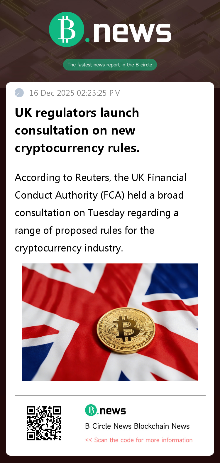 According to Reuters, the UK's Financial Conduct Authority (FCA) launched a broad consultation on a series of proposed rules for the cryptocurrency industry on Tuesday. This comes a day after the UK government announced it would begin regulating the industry from October 2027. Along with the proposals, the FCA also released a research report showing that the proportion of UK adults holding cryptocurrency has fallen by a third over the past year, from 12% to 8%. The FCA stated on Tuesday that its rules will cover the listing of crypto assets, measures to prevent insider trading and manipulation, standards for cryptocurrency trading platforms, and brokerage rules. The agency is also consulting on prudential requirements, regulations to make cryptocurrency staking risks clearer, better protection for both lenders and borrowers in the cryptocurrency market, and potential financial safeguards for crypto companies to manage risk. The FCA is seeking feedback on its proposals until February 12, 2026. The regulator has pledged to finalize the regulatory framework by the end of next year. (Source: Reuters)