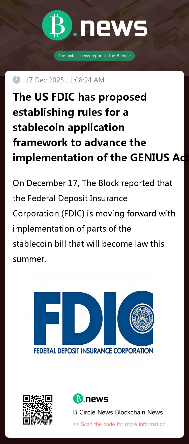 On December 17, The Block reported that the Federal Deposit Insurance Corporation (FDIC) is moving forward with implementation of parts of the stablecoin bill that will become law this summer. On Tuesday, the FDIC Board of Directors approved a proposed rulemaking notice that sets out the application process for institutions issuing payment stablecoins through subsidiaries. The agency is currently soliciting public comments on the proposed rule. At the Board meeting, FDIC legal counsel Nicholas Simons stated that applications must clearly define the scope of the proposed activities, provide a description of the "subsidiary's ownership and control structure," and include "an engagement letter with a registered public accountant firm." Simons stated, "In summary, the proposed rule will allow the FDIC to assess the safety and robustness of proposed payment stablecoin activities while minimizing the regulatory burden on applicants." (Source: The Block)