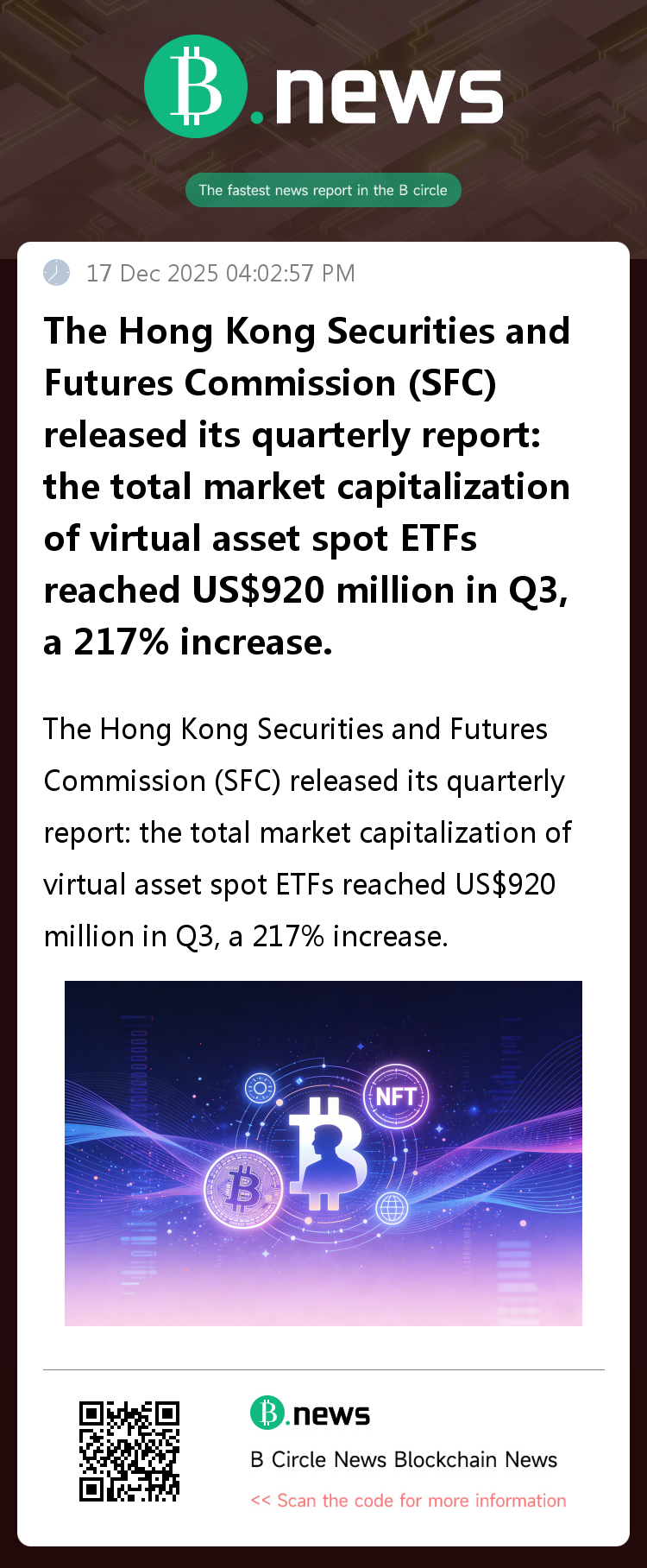 The Hong Kong Securities and Futures Commission (SFC) released its Q3 report for July to September 2025, disclosing that the total market capitalization of virtual asset spot ETFs reached US$920 million in Q3, a 217% increase since their launch. The assets under management of five tokenized money market funds reached HK$5.387 billion (approximately US$692 million), a 391% increase compared to the previous quarter. Furthermore, the SFC stated that it has confirmed the stamp duty exemption for ETF transfers applies to tokenized ETFs, aiming to promote secondary market trading of tokenized ETFs and further expand market access for tokenized fixed income and money market products. Licenses have already been issued to 11 virtual asset trading platforms, and license applications from 8 other virtual asset trading platform applicants are under review. (Source: Jinse Finance)