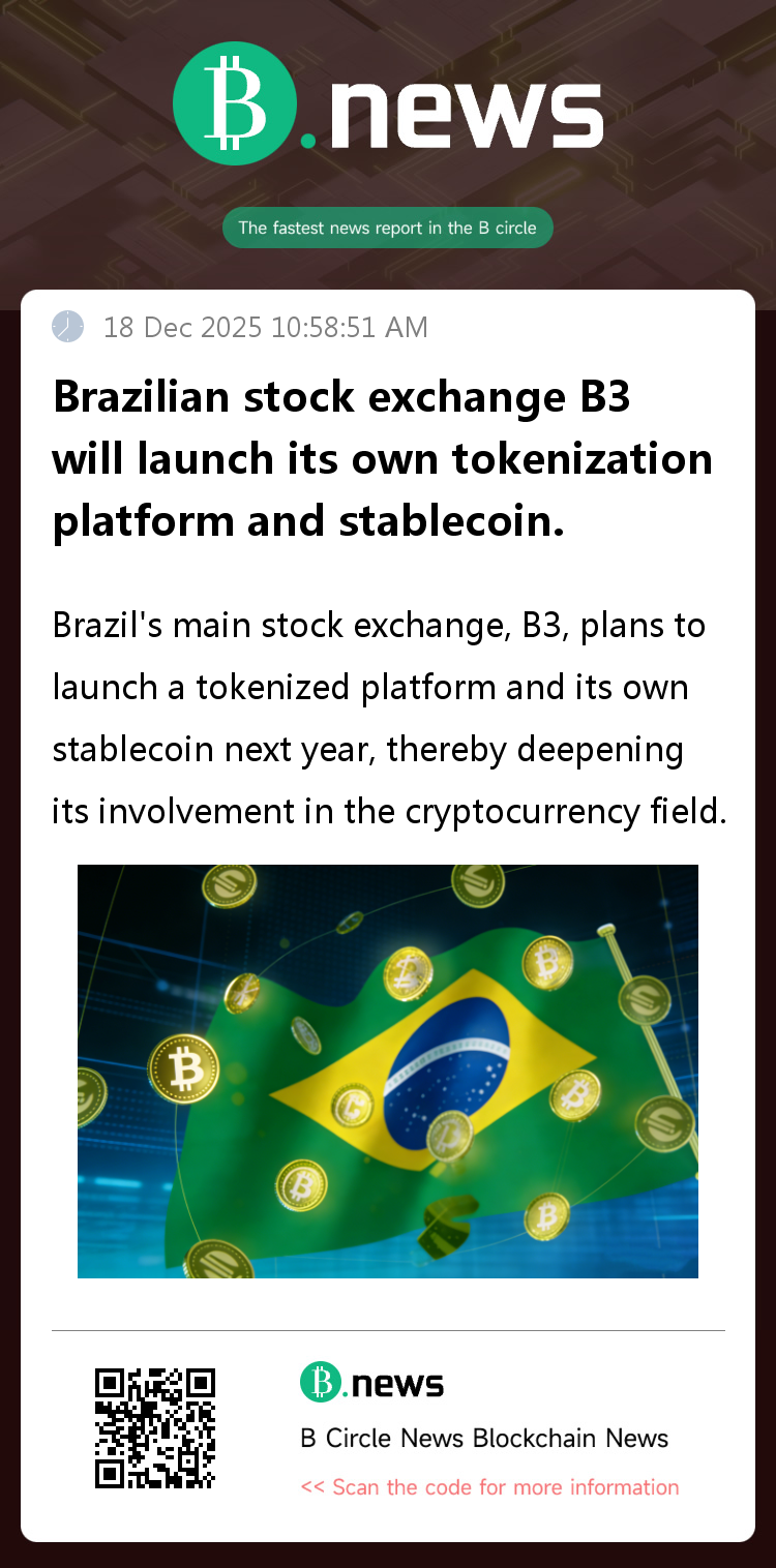 Brazil's major stock exchange, B3, plans to launch a tokenization platform and its own stablecoin next year, deepening its involvement in the cryptocurrency space. This stablecoin will facilitate trading in tokenized assets and is expected to be pegged to the Brazilian real. The tokenization platform will allow assets to be tokenized and traded on the exchange. Luiz Masagao, Vice President of Product and Clients at B3, stated that the two systems will share the same liquidity pool. B3 is also expanding its cryptocurrency derivatives offerings, including new options and contracts pegged to cryptocurrency prices. (Source: Jinse Finance)