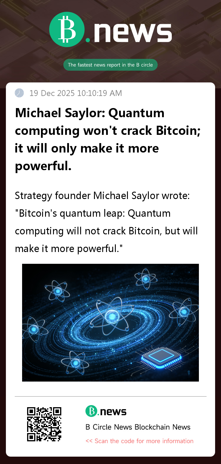 Strategy founder Michael Saylor wrote, "Bitcoin's quantum leap: Quantum computing won't crack Bitcoin; it will make it stronger. As the network upgrades, active Bitcoins will migrate to more secure addresses, while lost Bitcoins will be permanently frozen. Increased security and reduced supply make Bitcoin stronger." (Source: PANews)