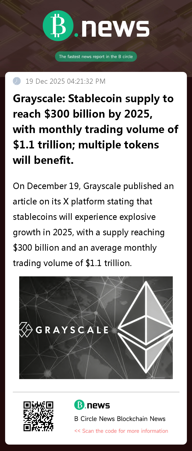 On December 19th, Grayscale published an article on its X platform stating that stablecoins will experience explosive growth in 2025, with a supply reaching $300 billion and monthly trading volume reaching $1.1 trillion. With the passage of the GENIUS Act (Stablecoin Genius Act), the increased adoption of stablecoins will benefit blockchain projects such as ETH, TRX, BNB, and SOL from the growing transaction flow. Infrastructure such as Chainlink (LINK) and emerging networks like XPL will also benefit.