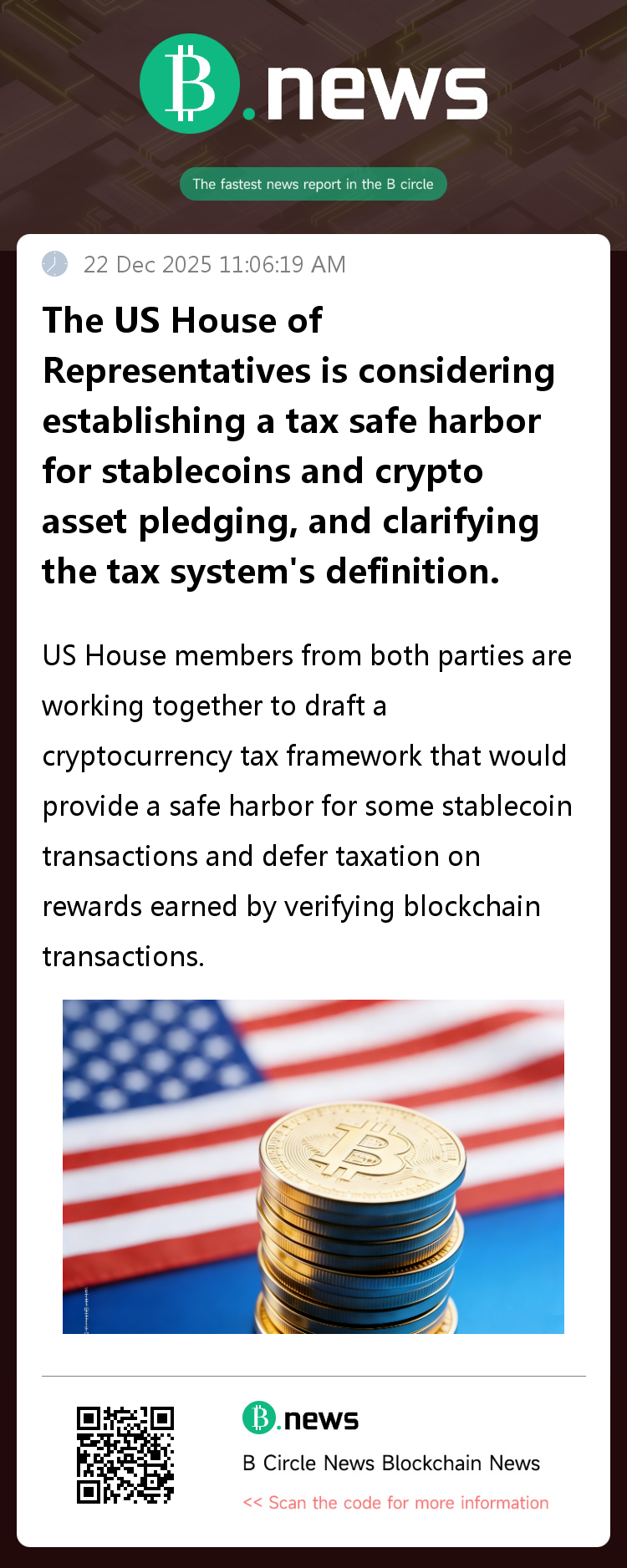 On December 22, according to Zhitong Finance, bipartisan members of the U.S. House of Representatives are working together to draft a cryptocurrency tax framework. This framework would provide a safe harbor for some stablecoin transactions and defer taxation on rewards earned through verifying blockchain transactions. While broader digital asset regulatory legislation is still under negotiation, the cryptocurrency industry remains eager to call for legislation clarifying the tax treatment of digital assets. Ohio Republican Representative Max Miller and Nevada Democratic Representative Steven Horsford have responded to these calls by drafting a bill to align cryptocurrency taxation with traditional securities. The draft, which includes the bill's text and policy objectives, proposes exempting transactions of regulated stablecoins with a long-term value between $0.99 and $1.01 from capital gains tax. The proposal also attempts to establish safe harbor rules for the distribution and processing of staking and mining rewards that involve blockchain transaction verification. The draft also includes cryptocurrencies in a tax system that covers securities transactions and some commodity transactions. Capital gains tax exemptions enjoyed by foreign investors trading securities through domestic third parties and by securities lenders will also apply to digital assets. (Source: Zhitong Finance)