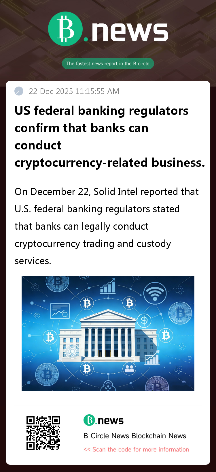 On December 22, Solid Intel reported that U.S. federal banking regulators stated that banks can legally conduct cryptocurrency trading and custody services.