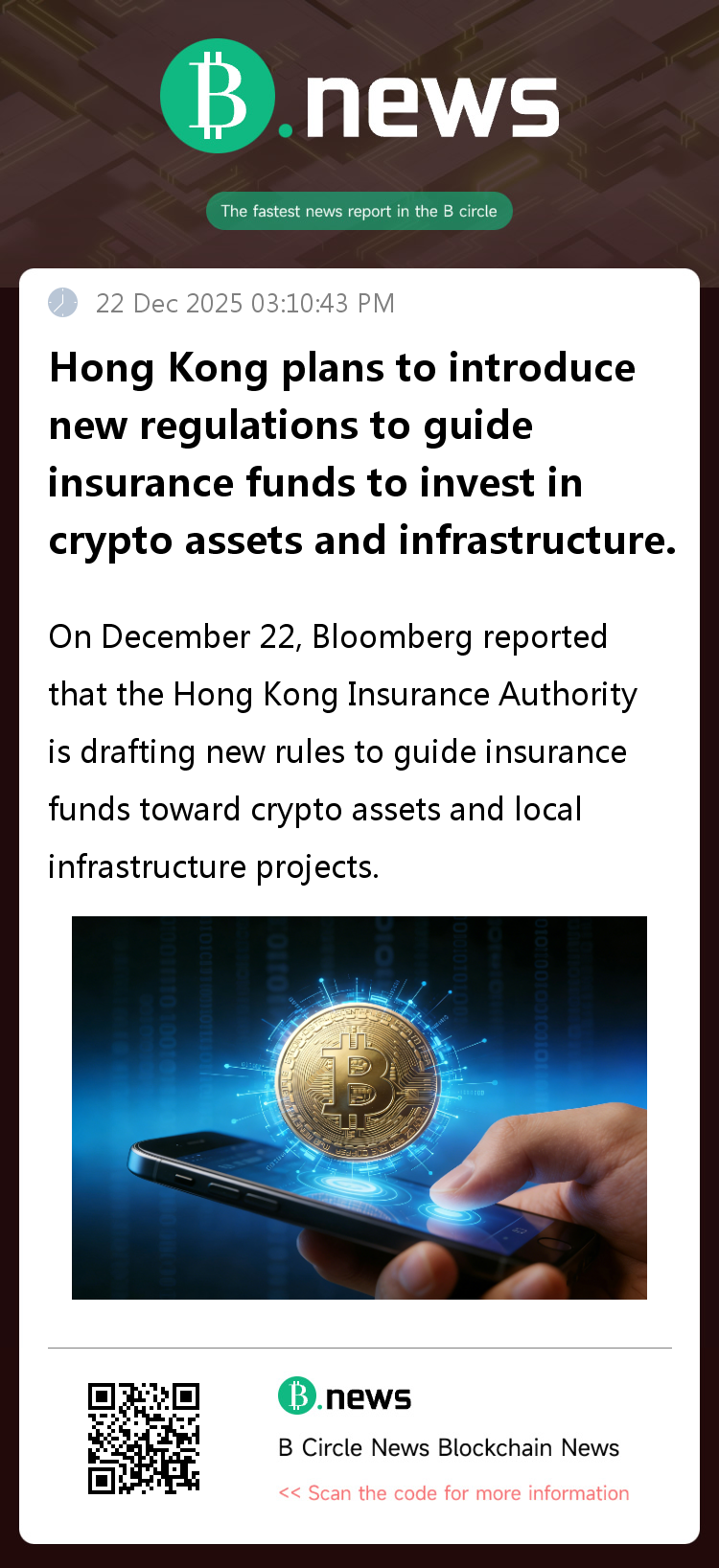 On December 22, Bloomberg reported that the Hong Kong Insurance Authority has drafted new regulations to guide insurance funds towards crypto assets and local infrastructure projects. The draft proposes imposing a 100% risk weight on crypto assets and a risk weight on stablecoins based on their fiat currency peg. The draft will be open for public comment from February to April 2026, and will subsequently be submitted to the legislative process. (Source: Bloomberg)