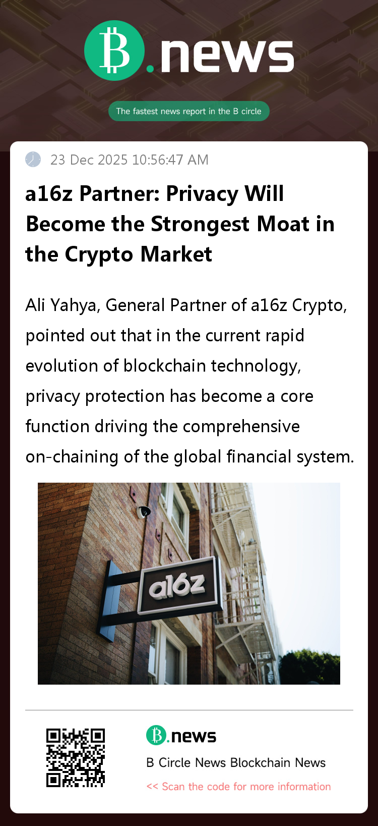 On December 23, Ali Yahya, General Partner of a16z Crypto, pointed out that in the current rapid evolution of blockchain technology, privacy protection has become a core function driving the comprehensive on-chaining of the global financial system.