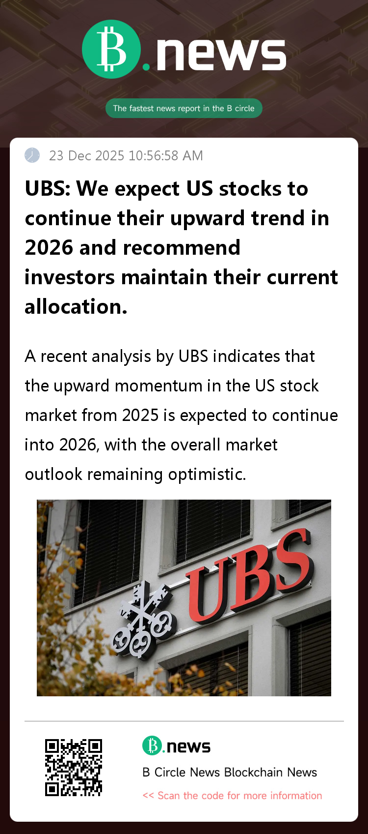 A recent analysis by UBS indicates that the upward momentum in the US stock market, driven by continued strong corporate earnings, a more accommodative monetary policy environment, and a gradually clearer outlook for key policies, is expected to extend into 2026, maintaining an optimistic overall market outlook.