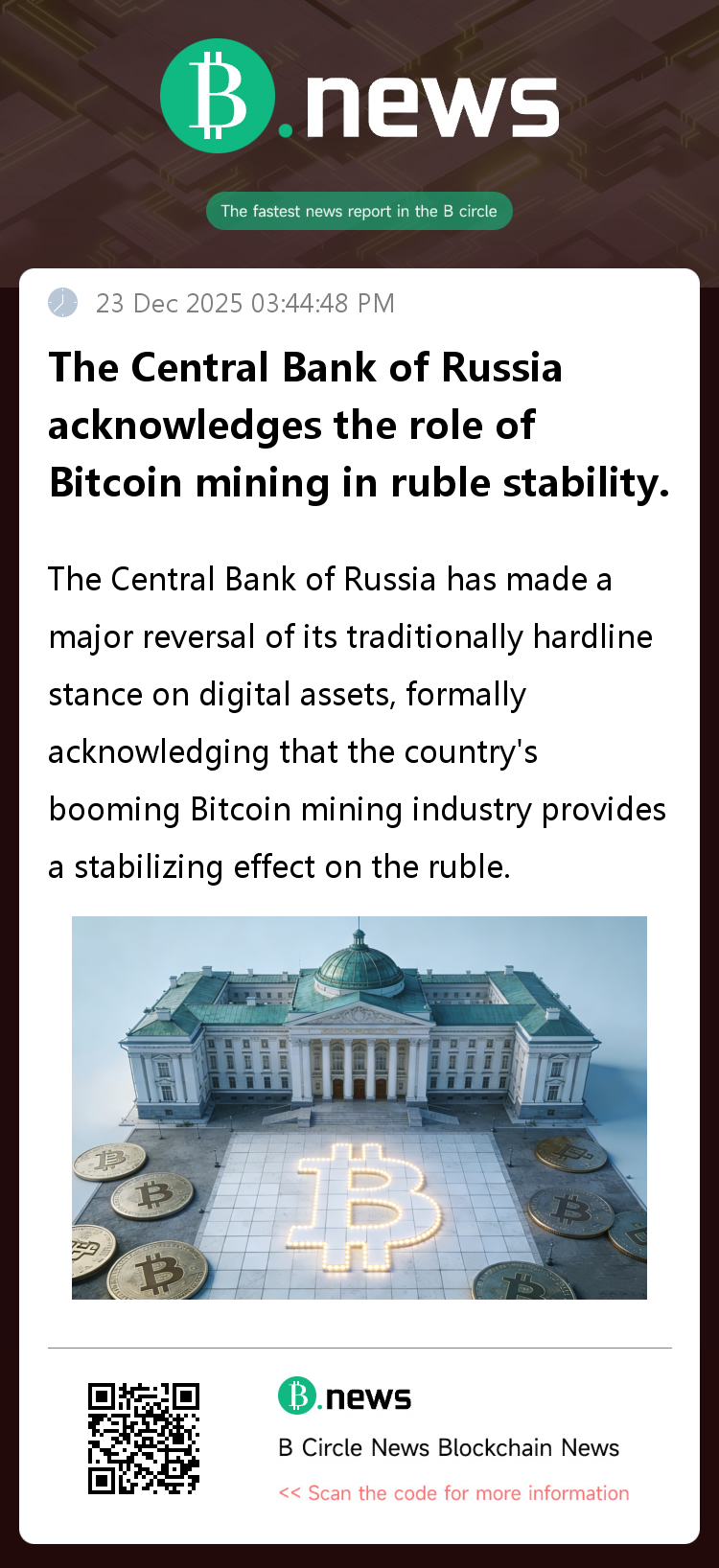 On December 23, according to financefeeds, the Central Bank of Russia made a major reversal from its traditionally hardline stance on digital assets, formally acknowledging that the country's booming Bitcoin mining industry has provided a stabilizing effect on the ruble. Governor Elvira Nabiullina made these remarks in a recent interview with the Royal Bank of Canada (RBC), noting that the value inflows from mining operations have become a contributing factor to supporting the national currency's exchange rate. This acknowledgment marks a pragmatic shift for the institution, which has long advocated for a complete ban on cryptocurrencies. While Nabiullina acknowledged that accurately quantifying the impact remains difficult due to a significant portion of the industry operating in a legal gray area, she viewed mining as a tangible macroeconomic variable. This development comes after a period of extreme economic pressure, as the country seeks alternative financial channels to circumvent international sanctions and manage liquidity. (Source: financefeeds)