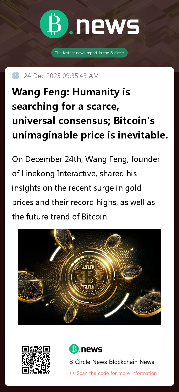 On December 24th, Wang Feng, founder of Linekong Interactive, shared his insights on the recent surge in gold prices and their record highs, as well as the future trend of Bitcoin.