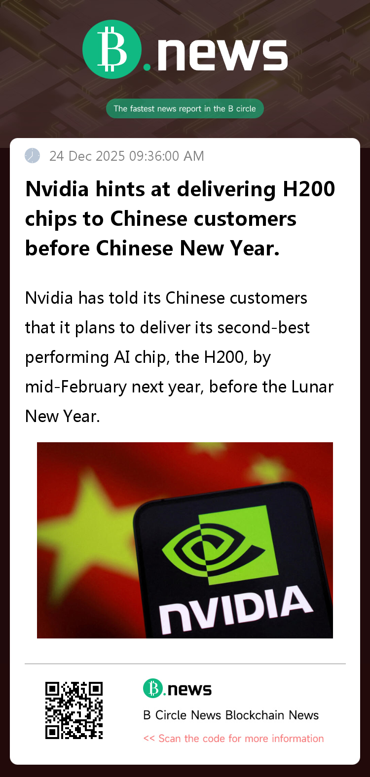 According to Reuters, multiple sources familiar with the matter revealed that Nvidia has informed its Chinese customers that it plans to deliver its second-highest performing AI chip, the H200, by mid-February next year, before the Lunar New Year.
