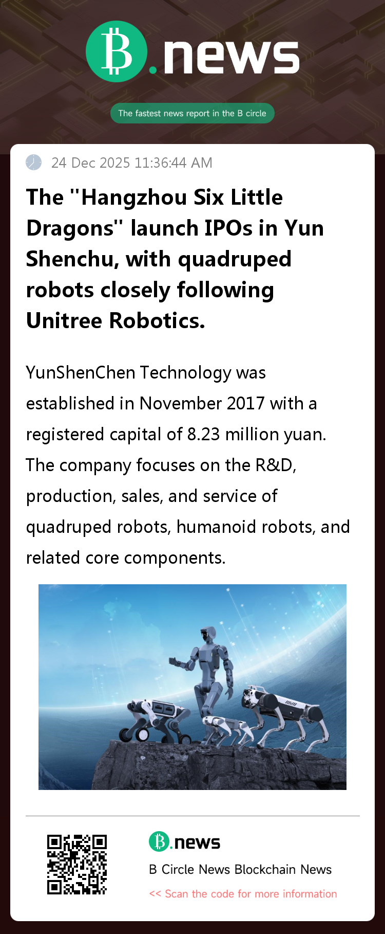 YunShenChen Technology was established in November 2017 with a registered capital of 8.23 million yuan. The company focuses on the R&D, production, sales, and service of quadruped robots, humanoid robots, and related core components.