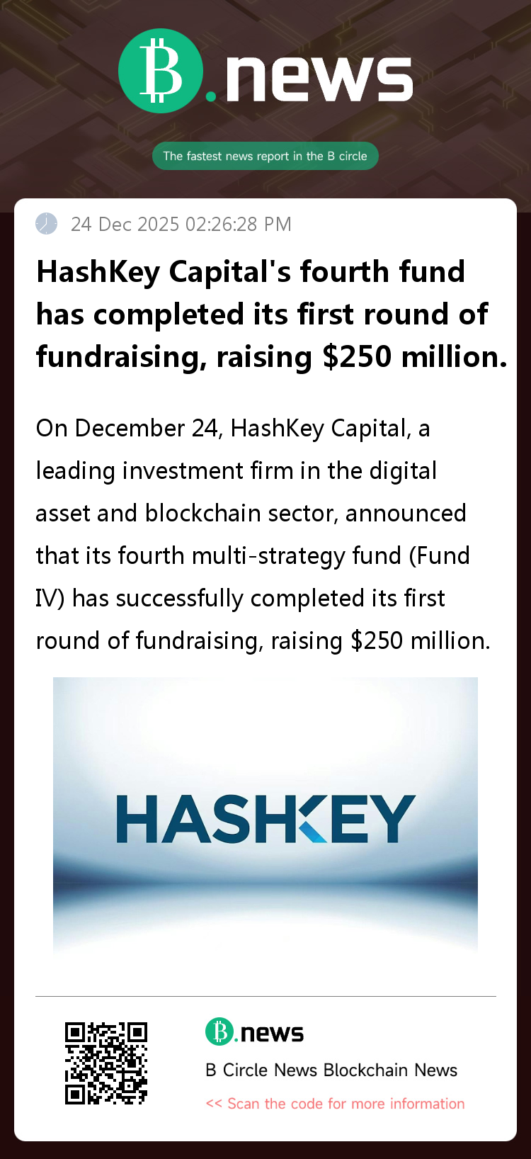 On December 24th, HashKey Capital, a leading investment firm in the digital asset and blockchain sector, announced the successful completion of its first round of fundraising for its fourth multi-strategy fund (Fund IV), raising $250 million, exceeding initial expectations. The fund's ultimate asset management target is $500 million, and the closing of the first round marks its official launch.