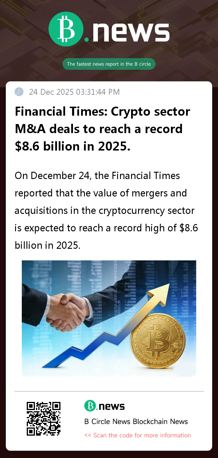 On December 24th, according to the Financial Times, cryptocurrency mergers and acquisitions (M&A) deals are projected to reach a record high of $8.6 billion in 2025. This surge in M&A activity is fueled by a more open attitude from the US government towards digital assets, and the market widely expects this trend to continue into next year.
