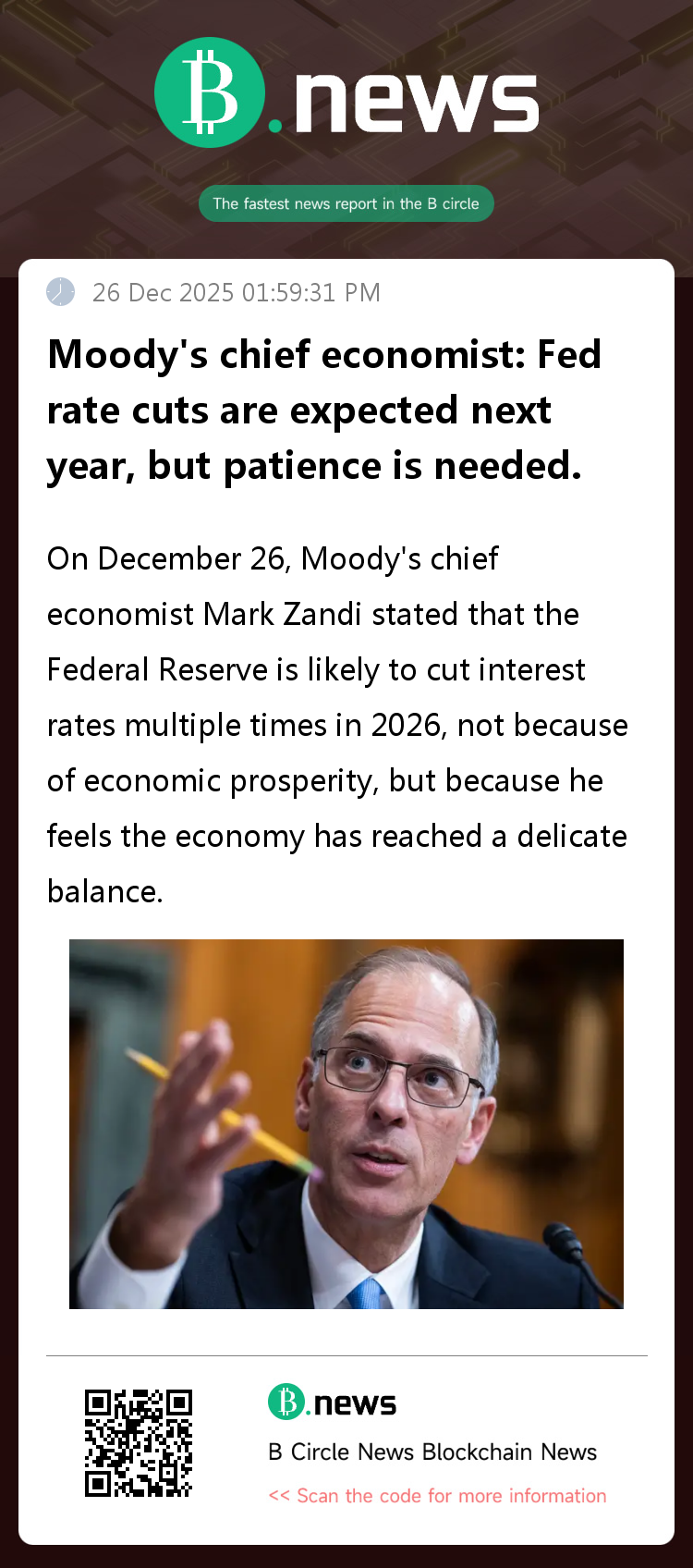 On December 26, Moody's chief economist Mark Zandi stated that the Federal Reserve is likely to cut interest rates multiple times in 2026, not because of economic prosperity, but because he feels the economy has reached a delicate balance.