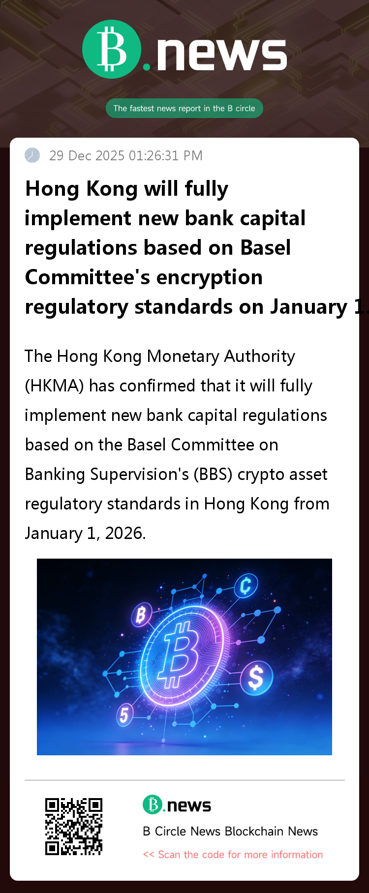 On December 29, Caixin reported that the Hong Kong Monetary Authority (HKMA) has confirmed that it will fully implement new bank capital regulations based on the Basel Committee on Banking Supervision's (BBS) standards for crypto-assets in Hong Kong starting January 1, 2026. Crypto-assets, as defined by the BBS, are private "digital assets" that primarily rely on cryptography and distributed ledger technology or similar technologies. "Digital assets" are defined as a digital representation of value that can be used for payment or investment purposes or to obtain goods or services. Not only Bitcoin and Ethereum fall under the BBS's definition of crypto-assets, but also RWA, stablecoins, and others. (Source: Caixin)