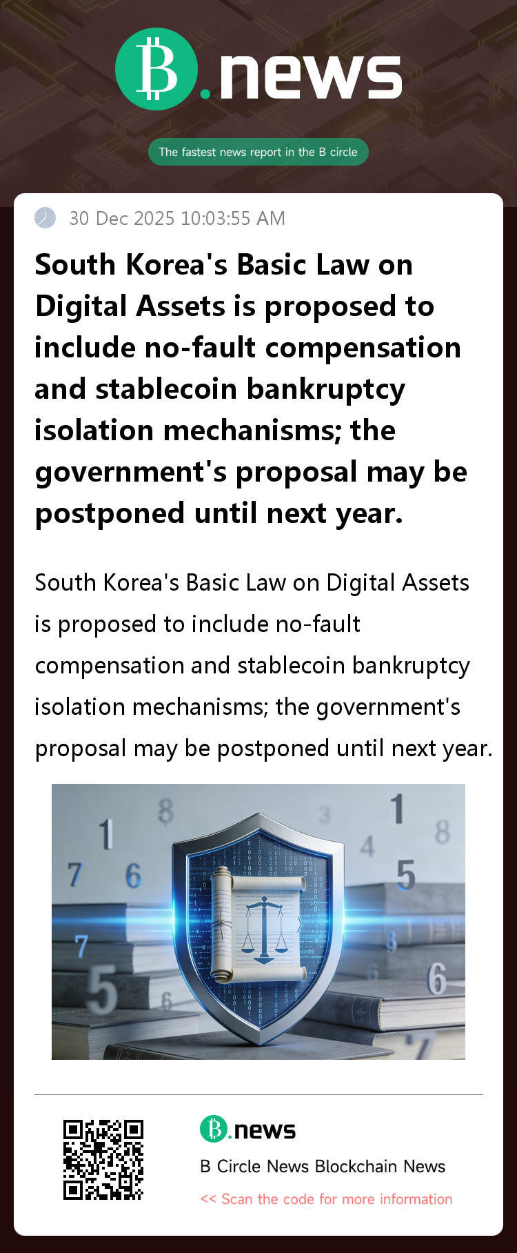 On December 30th, the South Korean government's draft "Digital Asset Basic Law" (the second phase of legislation for crypto assets) proposes to include several investor protection measures, including introducing no-fault liability for digital asset service providers and establishing a bankruptcy risk isolation mechanism for stablecoin issuers. However, due to significant disagreements surrounding core issues such as the issuers of stablecoins, the government's submission of the draft is expected to be postponed until next year.
