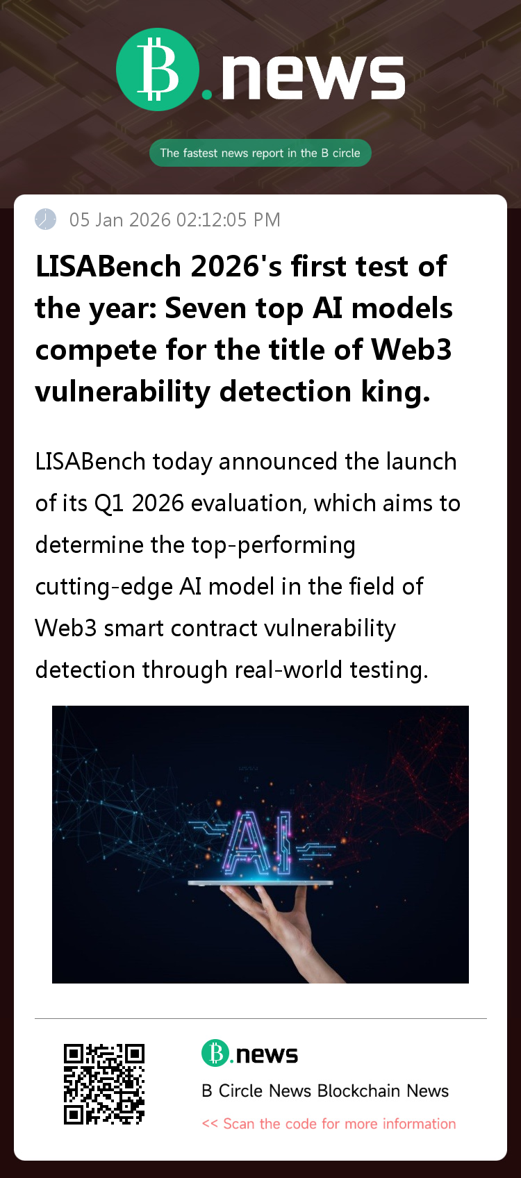 On January 5th, with the arrival of 2026, the AI security field ushered in its first major benchmark test. LISABench announced today the launch of its Q1 2026 evaluation, aiming to determine the top-performing cutting-edge AI model in Web3 smart contract vulnerability detection through practical testing. In addition, LISABench is simultaneously launching a community voting prediction reward program.