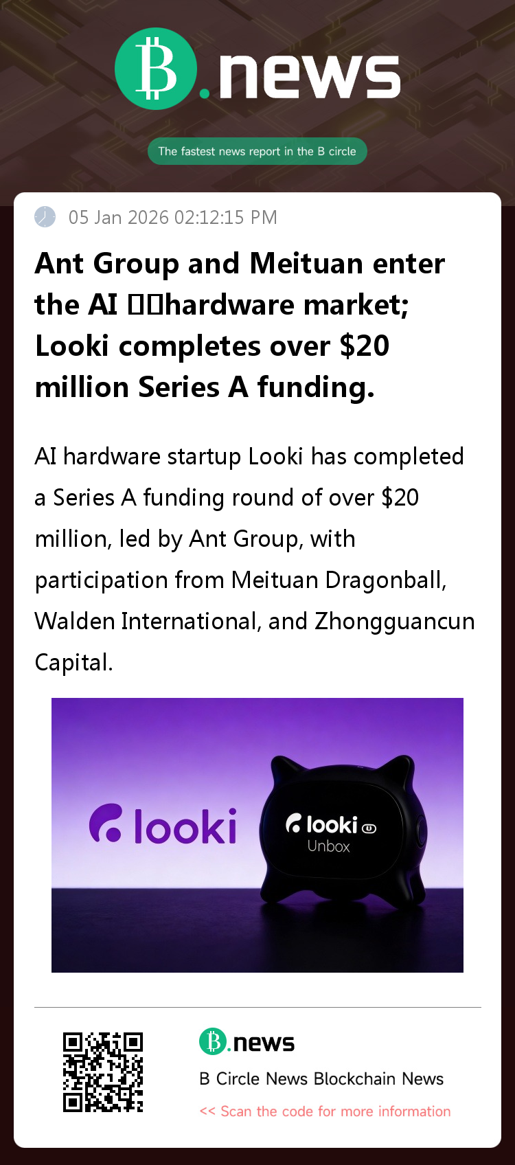 AI hardware startup Looki has completed a Series A funding round of over $20 million. The round was led by Ant Group, with participation from Meituan Dragon Ball, Walden International, and Zhongguancun Capital. Existing investor BAI Capital oversubscribed in its previous two rounds, and Alpha Commune and Tongge Ventures also increased their investment. Looki will focus on strengthening its talent pool, model iteration, product development, and supply chain integration. (Founder Park)