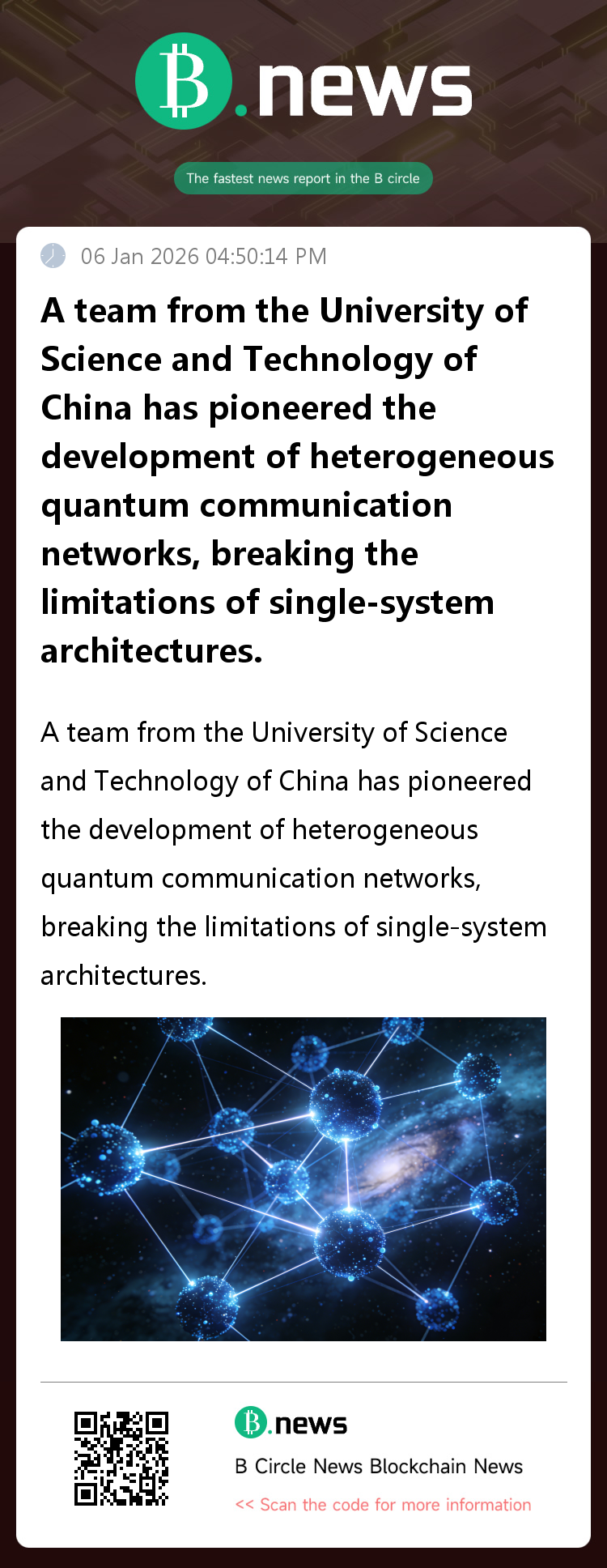 A team led by Academician Guo Guangcan of the University of Science and Technology of China, including Professors Han Zhengfu and Chen Wei, in collaboration with Professor Xue Kaiping and others from the same university, has made progress in constructing heterogeneous quantum networks. They have innovatively proposed and experimentally demonstrated a fully heterogeneous quantum network architecture and its key supporting technologies. Based on this architecture, they have realized an open interconnection network between quantum systems of different physical dimensions, while simultaneously supporting the parallel execution and automatic optimization of multiple different quantum tasks. This lays a crucial technological foundation for a blueprint towards an open and diverse quantum internet. This achievement was published in the international academic journal *Nature Communications*. (Source: Science and Technology Innovation Board Daily)