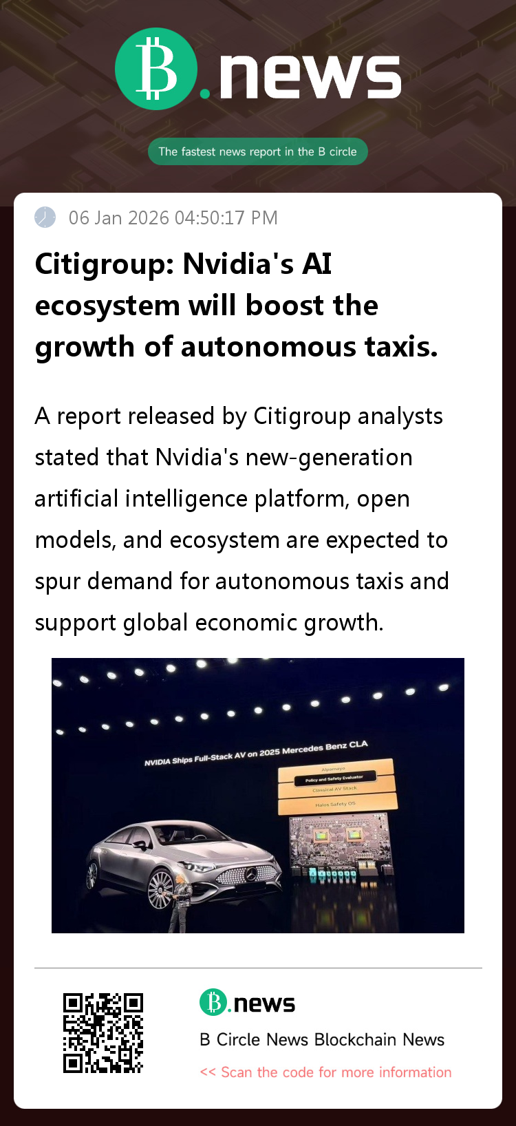 A report released by Citigroup analysts stated that Nvidia's next-generation AI platform, open model, and ecosystem are expected to spur demand for autonomous taxis and support global economic growth. Citigroup projects that the global autonomous taxi market will expand from $4.43 billion in 2025 to $188.91 billion in 2034. The reachable market for autonomous taxis in China is expected to grow from $39 million in 2025 to $67.59 billion in 2035. Citigroup noted that Nvidia's moves may boost investor confidence. (Source: Cailian Press)
