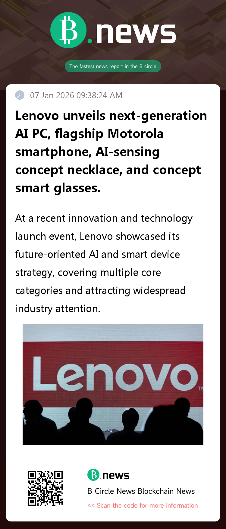 The launch included a next-generation AI PC leading performance innovation, a new flagship smartphone under its Motorola brand, and two groundbreaking wearable devices: an AI concept necklace with environmental awareness capabilities and concept smart glasses integrating real-world and digital information.