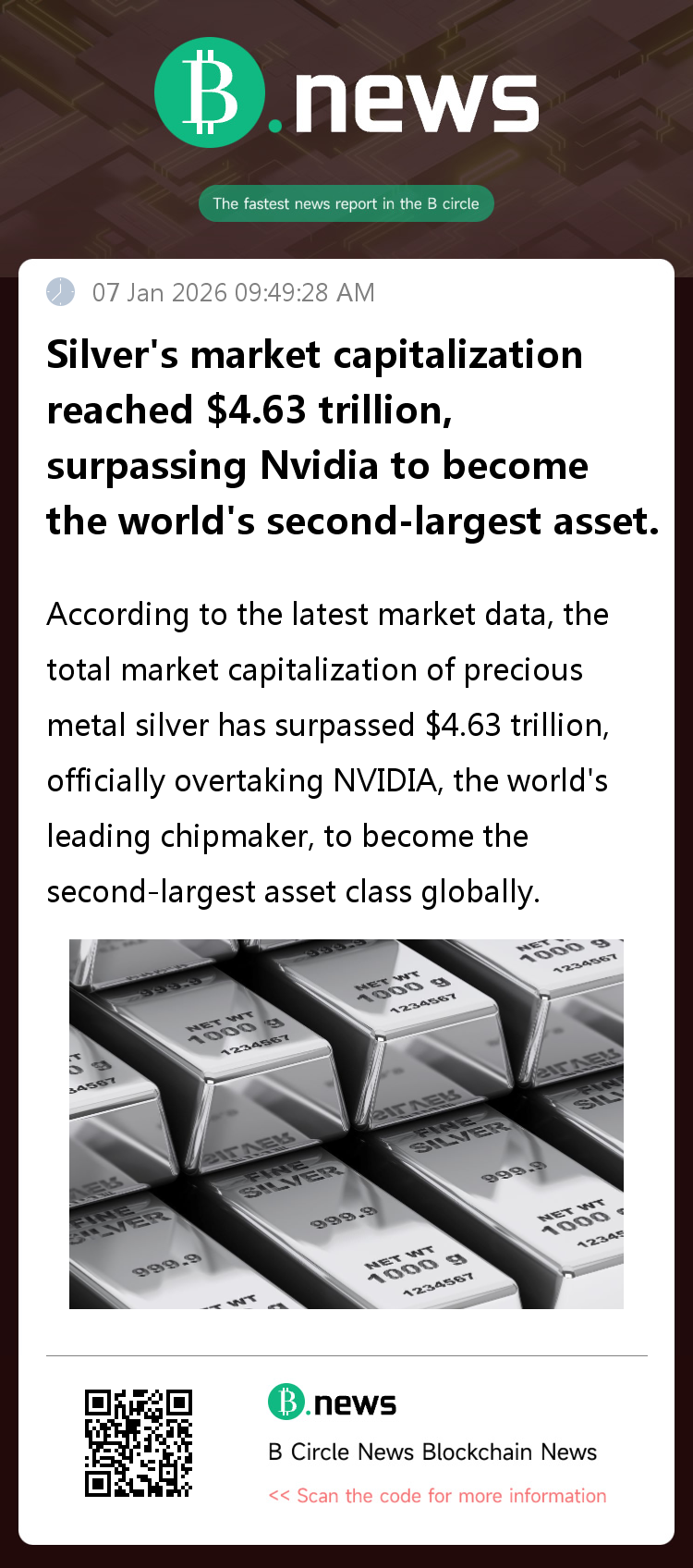 According to the latest market data, the total market capitalization of precious metal silver has surpassed $4.63 trillion, officially overtaking NVIDIA, the world's leading chipmaker, to become the second-largest asset class globally.