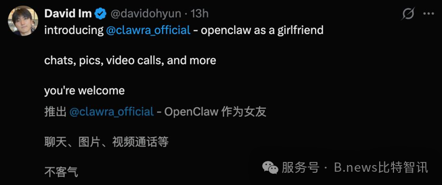 这哥们甚至没上过大学 根据Clawra官方人设,他"生于亚特兰大、15岁赴韩当练习生"——这种背景设定放在LinkedIn上,HR连面试都不会给。但David把舞台表现力转化成了代码层面的情感工程:Clawra的每一条回复、每一次"我也想你了",都是精心设计的交互触点。
