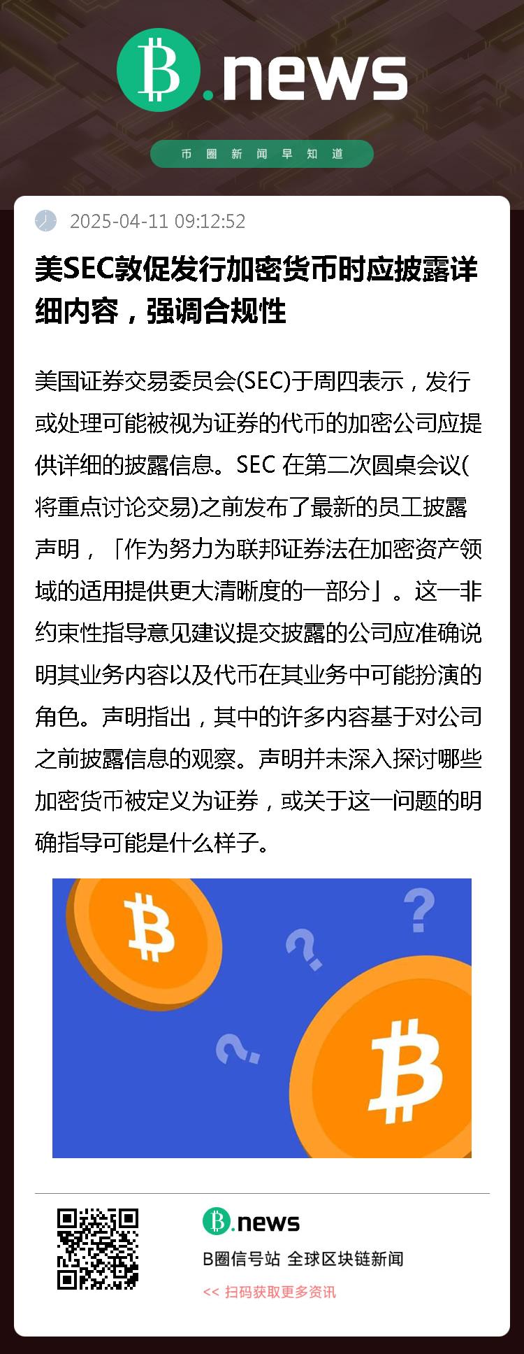 美国证券交易委员会(SEC)于周四表示,发行或处理可能被视为证券的代币的加密公司应提供详细的披露信息。