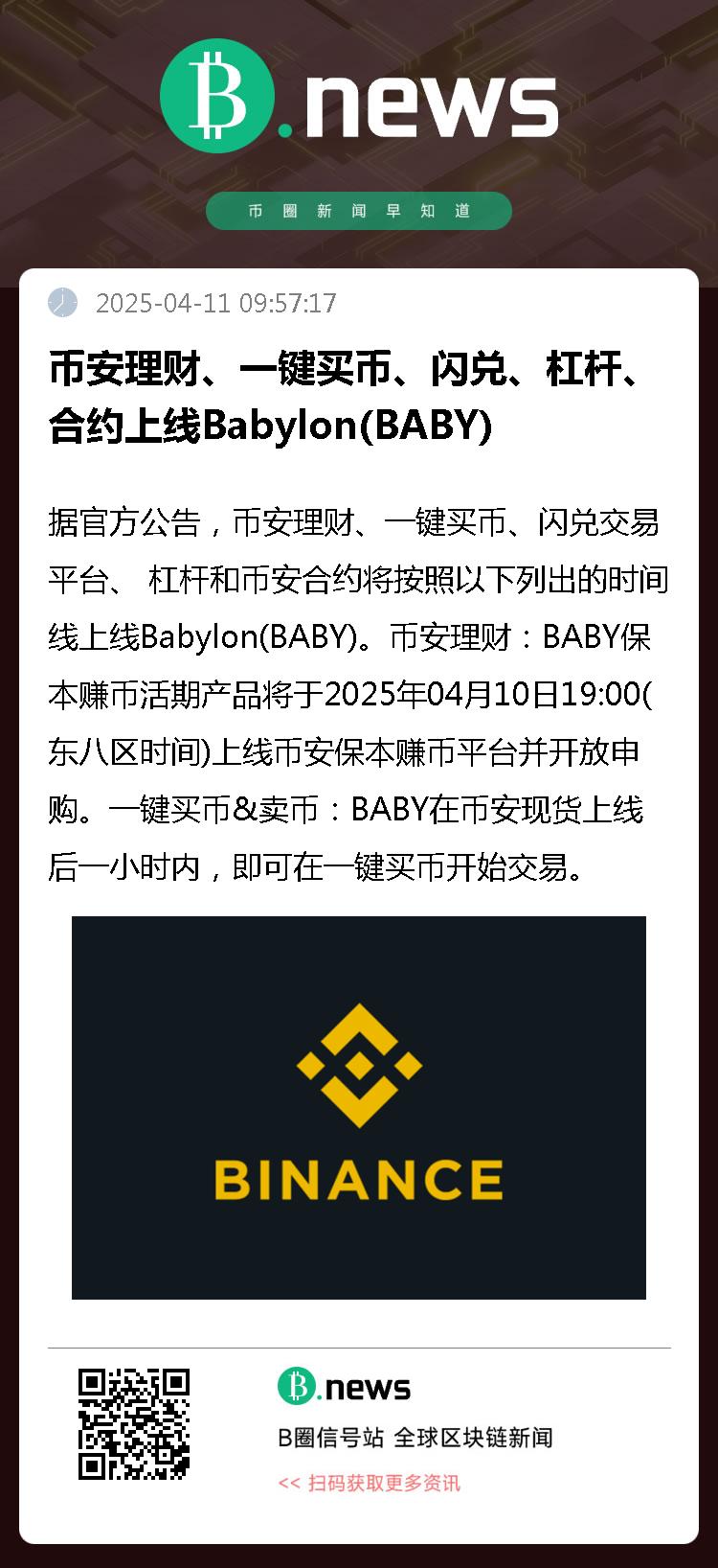 币安理财:BABY保本赚币活期产品将于2025年04月10日19:00(东八区时间)上线币安保本赚币平台并开放申购。