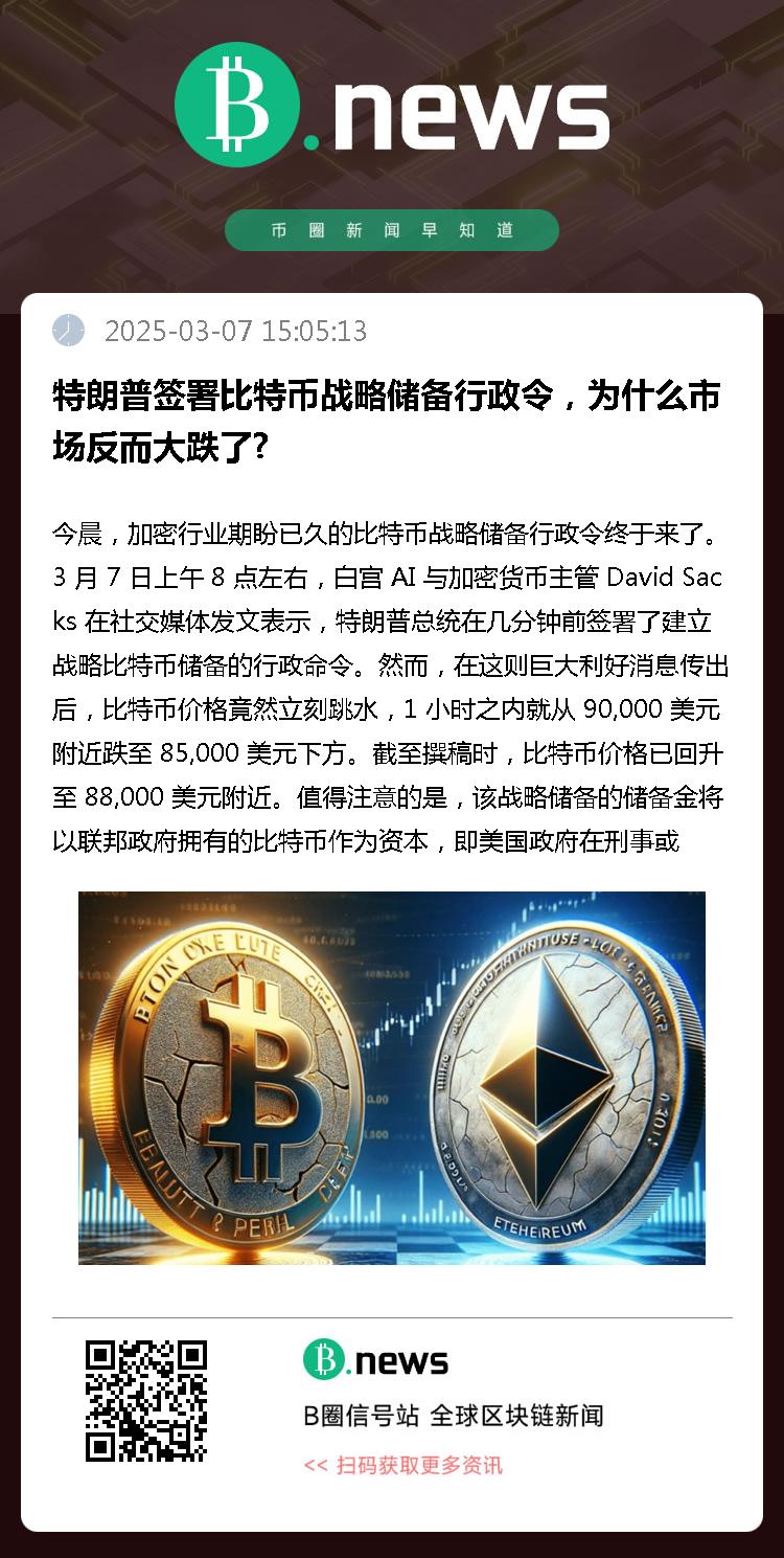 今晨,加密行业期盼已久的比特币战略储备行政令终于来了。3 月 7 日上午 8 点左右,白宫 AI 与加密货币主管 David Sacks 在社交媒体发文表示,特朗普总统在几分钟前签署了建立战略比特币储备的行政命令。然而,在这则巨大利好消息传出后,比特币价格竟然立刻跳水,1 小时之内就从 90,000 美元附近跌至 85,000 美元下方。截至撰稿时,比特币价格已回升至 88,000 美元附近。