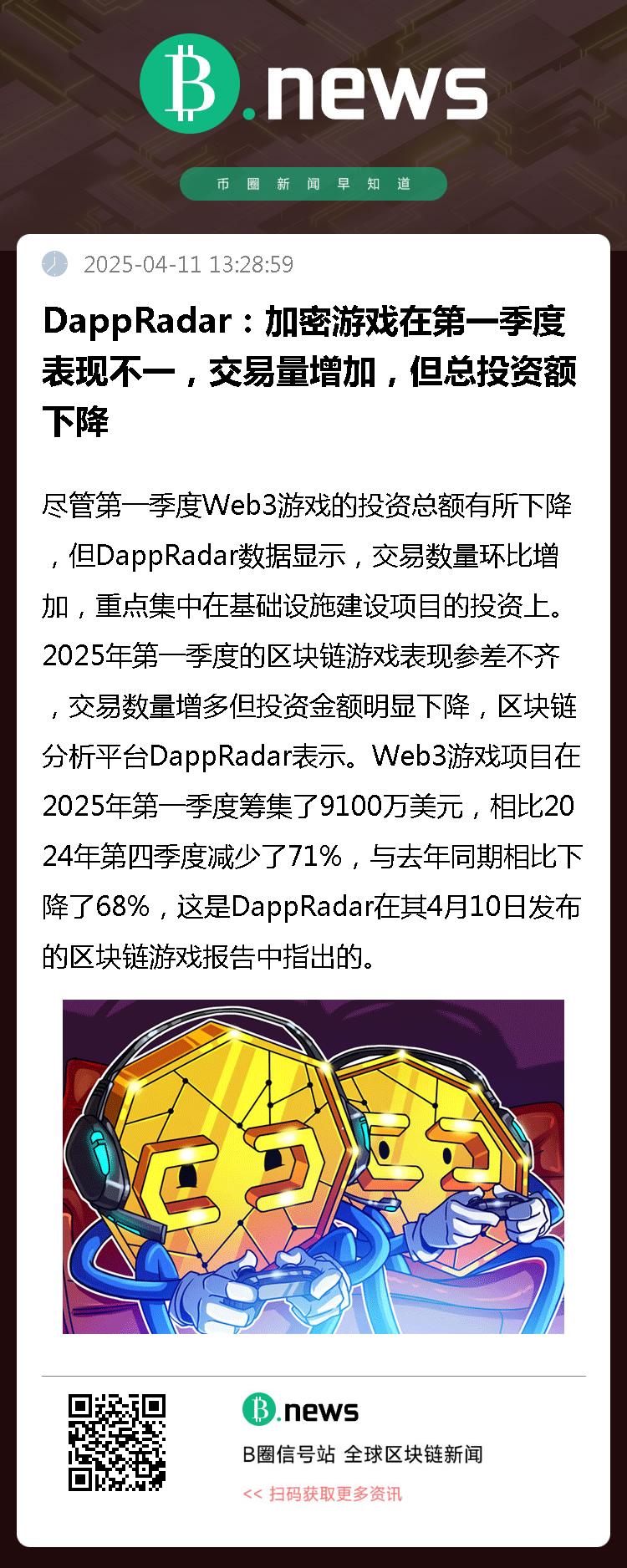 Web3游戏项目在2025年第一季度筹集了9100万美元,相比2024年第四季度减少了71%,与去年同期相比下降了68%,这是DappRadar在其4月10日发布的区块链游戏报告中指出的。