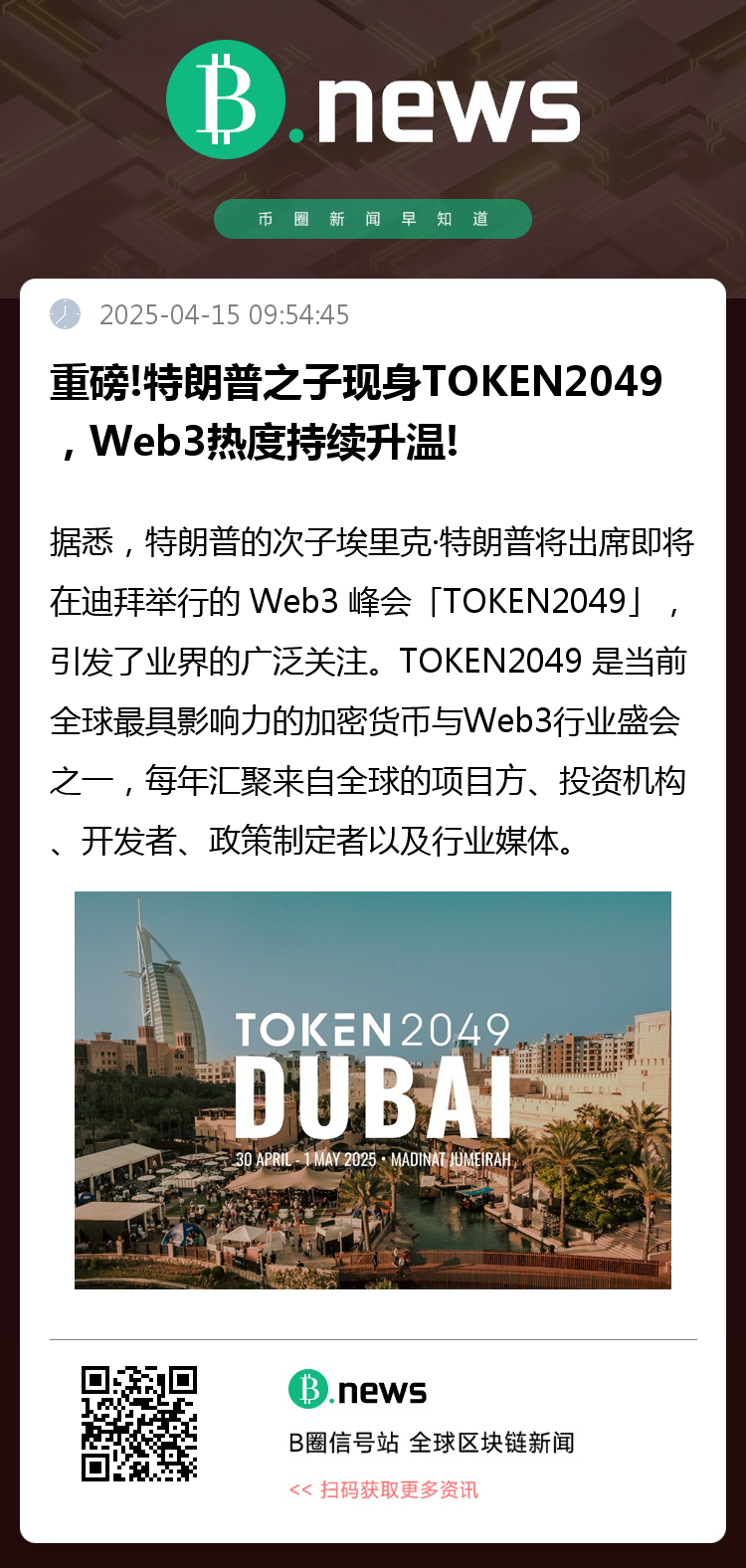 据悉,特朗普的次子埃里克·特朗普将出席即将在迪拜举行的 Web3 峰会「TOKEN2049」,引发了业界的广泛关注。