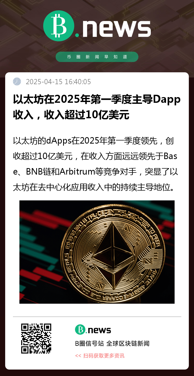 以太坊的dApps在2025年第一季度领先,创收超过10亿美元,在收入方面远远领先于Base、BNB链和Arbitrum等竞争对手,突显了以太坊在去中心化应用收入中的持续主导地位。