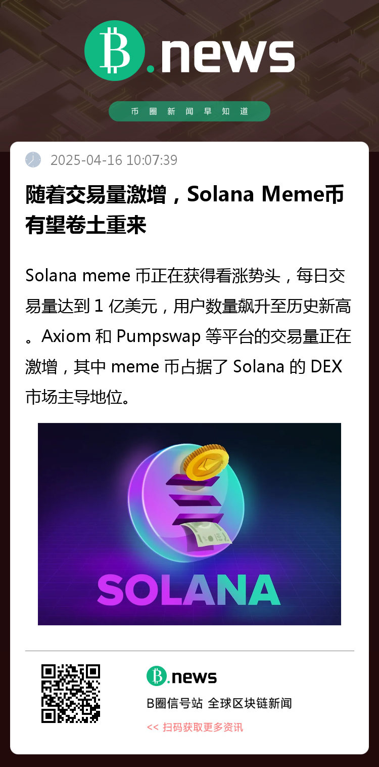 “4 月 14 日,Meme 交易平台 Axiom 的日交易量首次突破 1 亿美元,占据了 Solana Meme 交易平台约 50% 的市场份额。交易用户数量达到 26,800 人,创历史新高。”吴忌寒称。