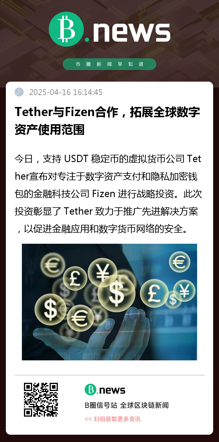今日,支持 USDT 稳定币的虚拟货币公司 Tether宣布对专注于数字资产支付和隐私加密钱包的金融科技公司 Fizen 进行战略投资。此次投资彰显了 Tether 致力于推广先进解决方案,以促进金融应用和数字货币网络的安全。