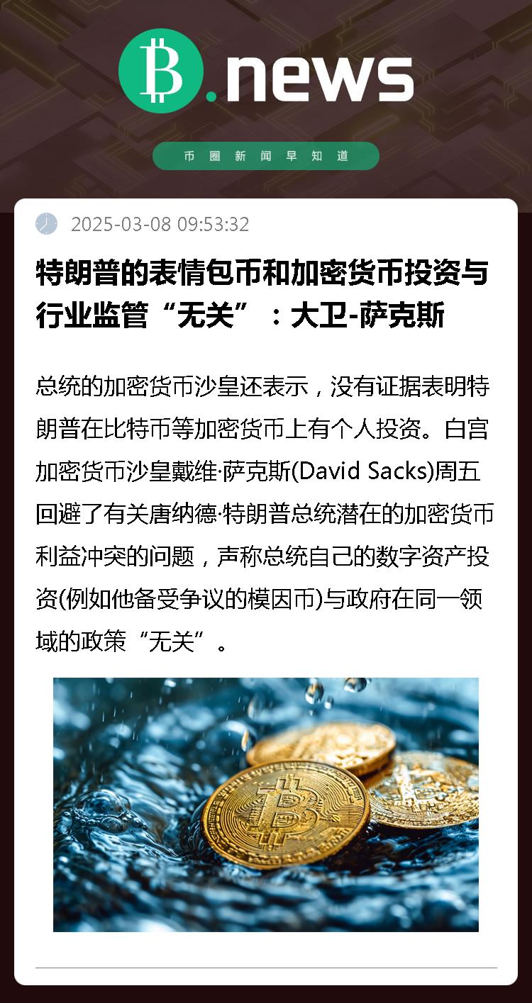 白宫加密货币沙皇戴维·萨克斯(David Sacks)周五回避了有关唐纳德·特朗普总统潜在的加密货币利益冲突的问题,声称总统自己的数字资产投资(例如他备受争议的模因币)与政府在同一领域的政策“无关”。