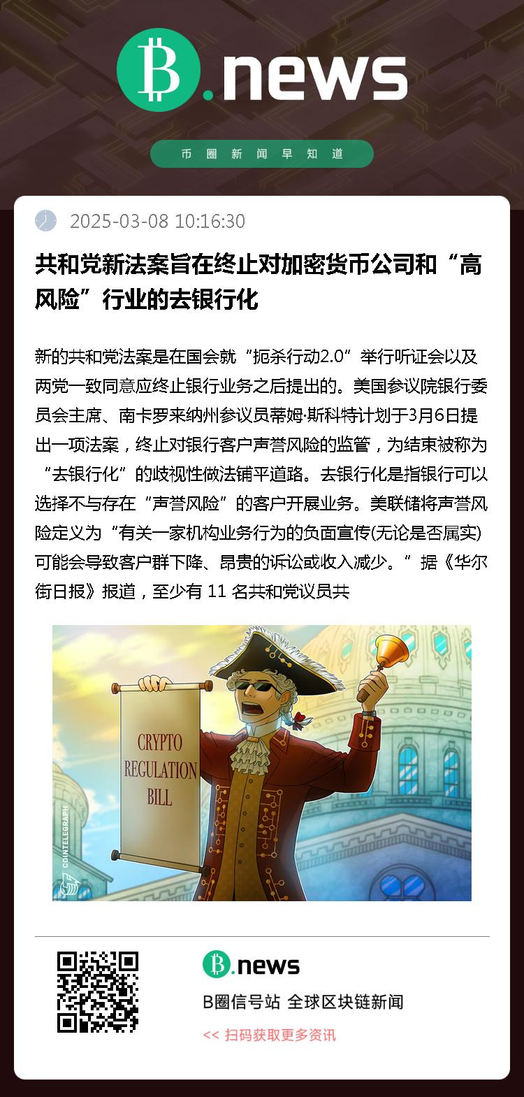 美国参议院银行委员会主席、南卡罗来纳州参议员蒂姆·斯科特计划于3月6日提出一项法案,终止对银行客户声誉风险的监管,为结束被称为“去银行化”的歧视性做法铺平道路。