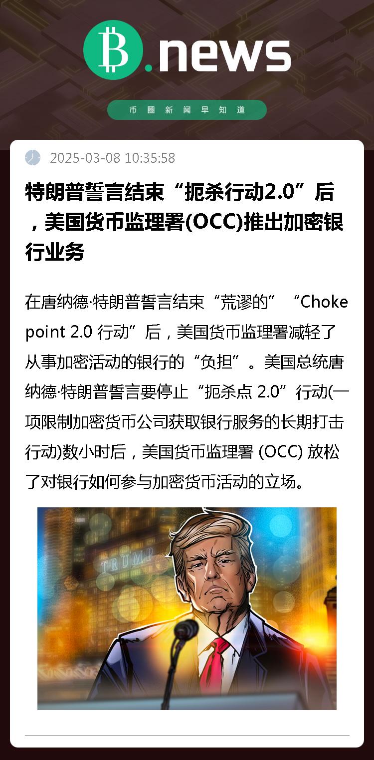 在唐纳德·特朗普誓言结束“荒谬的”“Chokepoint 2.0 行动”后,美国货币监理署减轻了从事加密活动的银行的“负担”。
