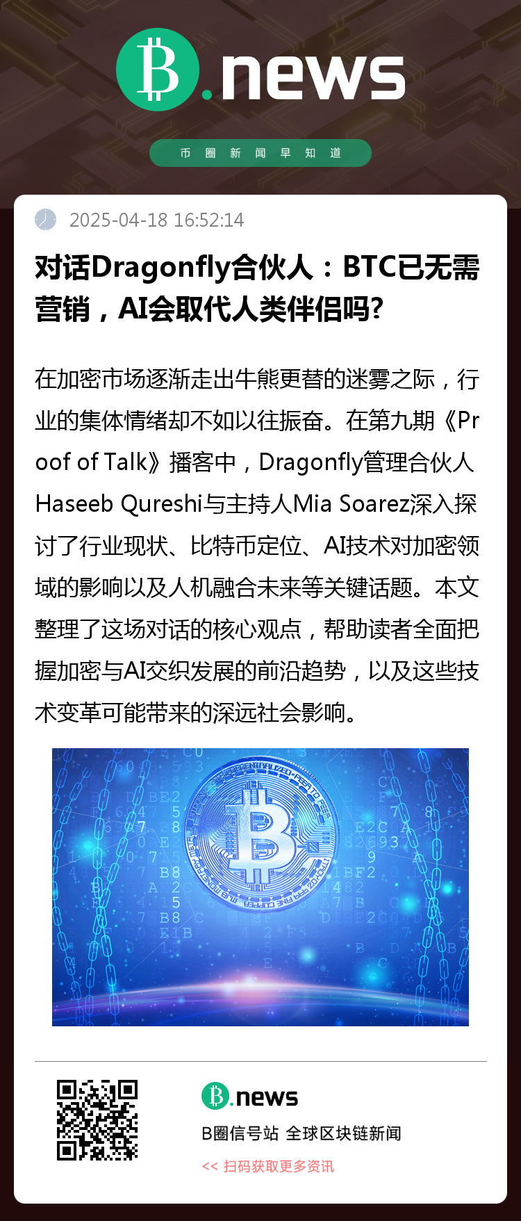 在加密市场逐渐走出牛熊更替的迷雾之际,行业的集体情绪却不如以往振奋。在第九期《Proof of Talk》播客中,Dragonfly管理合伙人Haseeb Qureshi与主持人Mia Soarez深入探讨了行业现状、比特币定位、AI技术对加密领域的影响以及人机融合未来等关键话题。本文整理了这场对话的核心观点,帮助读者全面把握加密与AI交织发展的前沿趋势,以及这些技术变革可能带来的深远社会影响。
