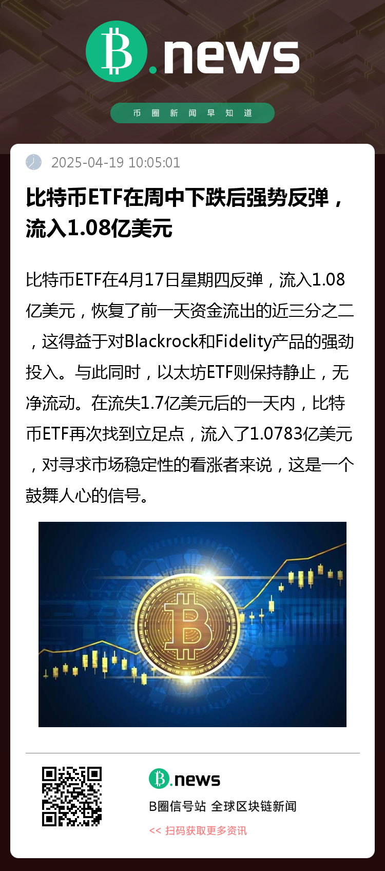 比特币ETF在4月17日星期四反弹,流入1.08亿美元,恢复了前一天资金流出的近三分之二,这得益于对Blackrock和Fidelity产品的强劲投入。与此同时,以太坊ETF则保持静止,无净流动。