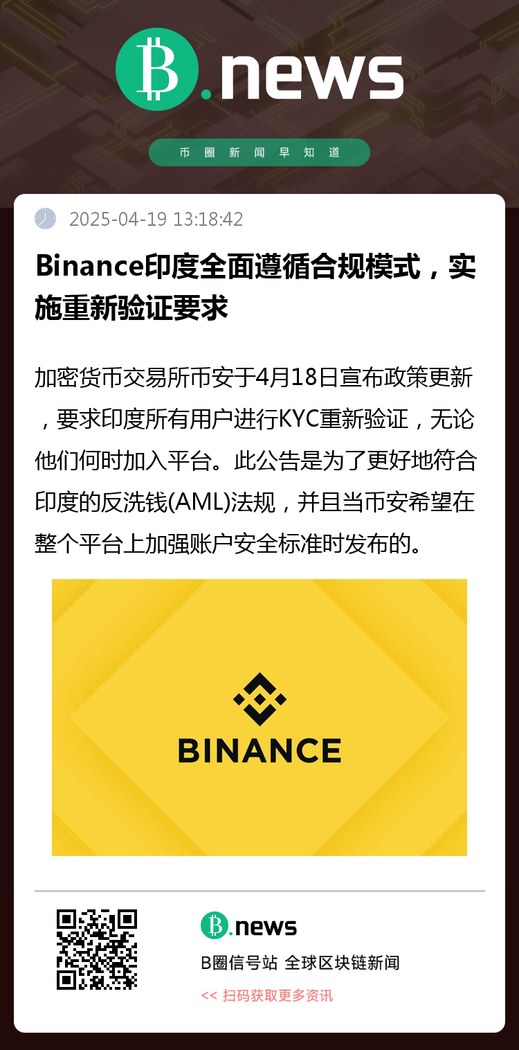 加密货币交易所币安于4月18日宣布政策更新,要求印度所有用户进行KYC重新验证,无论他们何时加入平台。此公告是为了更好地符合印度的反洗钱(AML)法规,并且当币安希望在整个平台上加强账户安全标准时发布的。