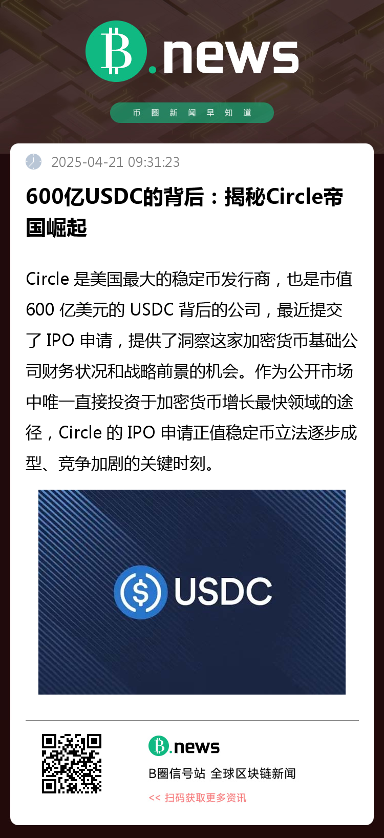 Circle 是美国最大的稳定币发行商,也是市值 600 亿美元的 USDC 背后的公司,最近提交了 IPO 申请,提供了洞察这家加密货币基础公司财务状况和战略前景的机会。作为公开市场中唯一直接投资于加密货币增长最快领域的途径,Circle 的 IPO 申请正值稳定币立法逐步成型、竞争加剧的关键时刻。尽管市场条件可能导致 IPO 延迟,但结合 USDC 的链上数据,我们将从 Circle 的 IPO 文件中提取关键信息,分析其收入来源、利率对其业务的影响,以及 Coinbase 和 BN 等平台在塑造 USDC 分发中的作用,并评估 Circle 在日益竞争激烈的市场中的定位。