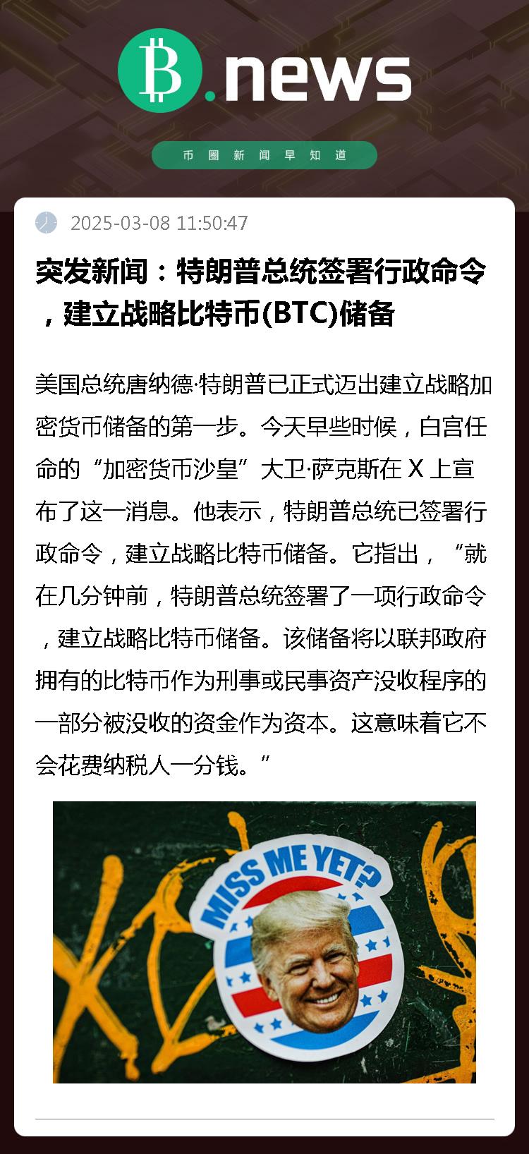 它指出,“就在几分钟前,特朗普总统签署了一项行政命令,建立战略比特币储备。该储备将以联邦政府拥有的比特币作为刑事或民事资产没收程序的一部分被没收的资金作为资本。这意味着它不会花费纳税人一分钱。”